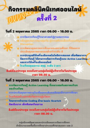 วันนี้ 3 พฤษภาคม 2565 ที่ สำนักงานตพื้นที่การศึกษาประถมศึกษาสงขลา เขต 2 (สพป.สงขลา เขต 2) อ.หาดใหญ่ จ.สงขลา นายอุทัย กาญจนะ ผอ.สพป.สงขลา เขต 2 ได้กล่าวถึง การพัฒนาคุณภาพครูในห้วงการแพร่ระบาดโรคโควิด 19 ว่า สพป.สงขลา เขต 2 โดยกลุ่มนิเทศ ติดตามและประเมินผลการจัดการศึกษา นำทีมโดย นางพิมพ์พันธ์ เฮ่งประดิษฐ์ ผอ.กลุ่มนิเทศฯ ได้จัดโครงการนิเทศบูรณาการ โดยใช้พื้นที่เป็นฐานรูปแบบคลินิกนิเทศออนไลน์ เพื่อพัฒนาการจัดการเรียนการสอนให้กับครูผู้สอนในสังกัดที่มีจำนวนโดยประมาณ จำนวน 1,640 คน โดยเปิดคลินิกนิเทศออนไลน์ 10 คลินิก มี คลินิก การจัดการเรียนรู้วิทยาศาสตร์สู่ฐานสมรรถนะ,หลักสูตรสมรรถนะปฐมวัย