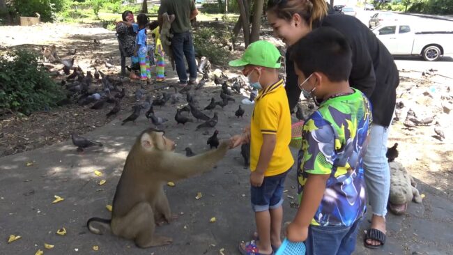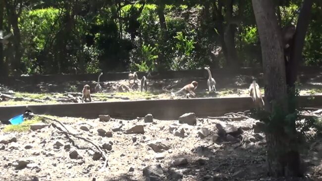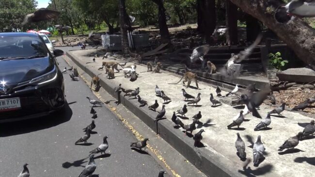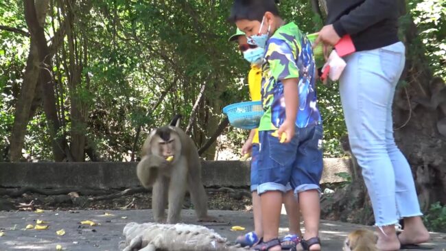 โดยในขณะที่ลิงเขาน้อยเพลิดเพลินอยู่กับการกินอาหารจากนักท่องเที่ยว ลิงเขาน้อยที่คอยเฝ้าระวังเจ้าไมเคิลลิงกังเขาตังกวน เมื่อเห็นเจ้าไมเคิลข้ามถนนมาก็ส่งสัญญาณเตือนภัยฝูงลิงเขาน้อยทันที ทำให้ลิงเขาน้อย ต้องถอยหนี กลับขึ้นเขา ไม่ต้องการมีเรื่อง โดยเป็นแบบนี้ทุกวัน เนื่องจากลิงเขาตังกวน ใช้อิทธิพล ไมเคิลลิงกังจ่าฝูง ลงมาไล่ลิงเขาน้อย เพื่อแย่งพื้นที่แหล่งอาหาร ที่นักท่องเที่ยว มาให้อาหารลิงทุกวัน เวลาที่เจ้าไมเคิล ลงมาไล่ลิงเขาน้อยทุกตัว เมื่อเห็นเจ้าไมเคิล ต่าง วิ่งหนีกันจ้าละหวั่น และทยอยกลับขึ้นเขาน้อยไปในทันทีไม่มีเหลือแม้แต่ตัวเดียว
