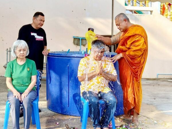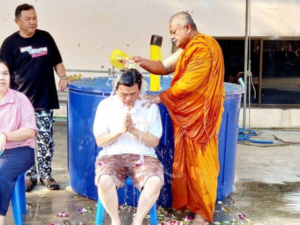 ปทุมธานี “คลื่นคนบุญแห่อาบน้ำมนต์ธรณีสารใหญ่” พระครูขันติธรรมรัต เจ้าอาวาส วัดตระพัง สามโคก กันอย่างคึกคัก