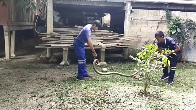จึงใช้อุปกรณ์ในการจับงูพยายามจับจงอางให้ได้ แต่งูจงอางดื้อ ไม่ยอมให้จับดีๆ จนเจ้าหน้าที่ต้องใช้วิธีจับตรงหางงูจงอางแล้วลากออกมาจากใต้สังกะสี ลากมายังที่โล่ง อยู่พักหนึ่งจึงใช้มือเปล่าจับหัวงูจงอางไว้ได้ รีบนำมาวัดได้ความยาว 3.12 เมตร จึงรีบนำใส่กระสอบเตรียมนำไปปล่อยคืนสู่ป่าธรรมชาติที่ห่างไกลบ้านเรือนผหู้คนต่อไป