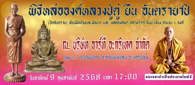 นครปฐม – บริษัท อาร์ที อะกริเทค จำกัด จัดพิธีหล่อองค์หลวงปู่ดู่ ยืน อันตรายาปิ และพระจักรพรรดิ์กินบ่เซี่ยง พร้อมฟังบรรยายธรรมโดย หลวงตาม้า วัดถ้ำเมืองนะ โดยมีสาธุชนจากทั่วสารทิศเข้าร่วมเป็นจำนวนมาก