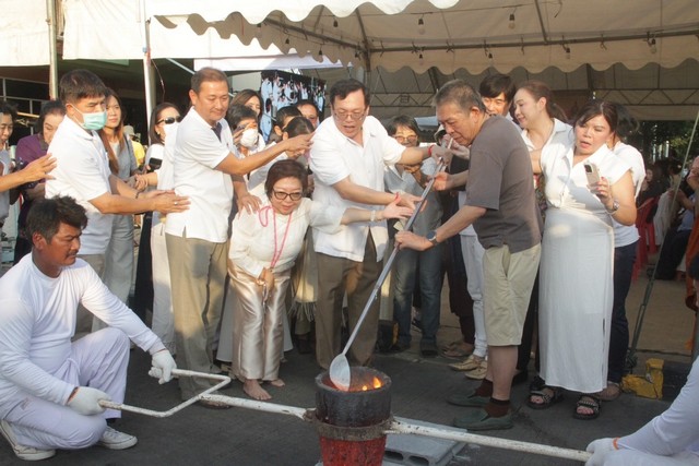สำหรับพิธีเริ่มเวลา 17.00 น. โดยผู้บริหารบริษัท อาร์ที อะกริเทค จำกัด พร้อมด้วยแขกผู้เกียรติ จุดธุปเทียนหน้าเครื่องบรวงสรวง หลังจากนั้น เป็นการเริ่มเททองหล่อองค์หลวงปู่ดู่ ยืน อันตรายาปิ (ปิดอันตราย) สูง 21 เมตร ส่วนมือขวาและมือซ้าย ต่อด้วยเป็นการหล่อองค์พระจักรพรรดิ์กินบ่เซี่ยง ขนาด 30 นิ้ว 2 องค์ และ 20 นิ้ว 2 องค์ ตามลำดับ