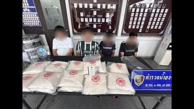 วันนี้ 10 กุมภาพันธ์ 2568 เวลา 15.00 น. พ.ต.อ.เศรษฐศิริ นิภพยะ รอง ผบก.ภ.จว.กาญจนบุรี รรท.ผบก.รน.ได้เดินทางมาแถลงข่าวในการจับกุมขบวนการเครือข่ายค้ายาเสพติดข้ามชาติ (เฮโรอีน) จำนวน 7.5 กก. พร้อมผู้ต้องหา 4 คน “ยุทธการ เด็ดปีกผู้ค้ายา อ่าวไทย”