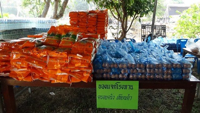 เมื่อถึงเวลา 13.00 น.เป็นการแจกของให้แก่ประชาชนทั้ง 3 ตำบลที่ถือบัตรจำนวน 400 ชุด ที่ประกอบไปด้วย ข้าวหอมมะลิ 5 กิโลกรัม ไข่ไก่ 10 ใบ น้ำดื่ม 12 ขวด พร้อมของกิน ขนม น้ำดื่ม ก๋วยเตี๋ยว และไอศรีม และหางบัตรจะมีการจับฉลากรับ เครื่องใช้ไฟฟ้าฟรี กว่า 40 รางวัล โดยภายในงานยังมีโรงทานให้รับประทานฟรีอีกด้วย