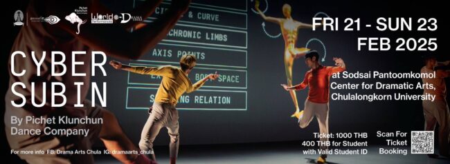 (ไซเบอร์ สุบิน) โดย พิเชษฐ กลั่นชื่น แดนซ์ คอมพานี (Pichet Klunchun Dance Company) การแสดงนาฏศิลป์ร่วมสมัยที่ร่วมสร้างสรรค์ระหว่างมนุษย์นักเต้น และ AI ณ ศูนย์ศิลปการละคร สดใส พันธุมโกมล ชั้น 6 อาคารมหาจักรีสิรินธร คณะอักษรศาสตร์ จุฬาลงกรณ์มหาวิทยาลัย 20 ก.พ. – 23 ก.พ. นี้