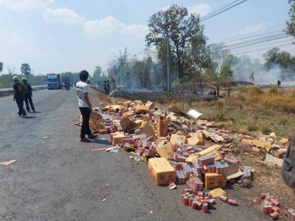 บุรีรัมย์ รถบรรทุกปลากระป๋องพลิกกระป๋องกระจายถูตามถนนกลายเป็นไฟลามทุ่ง