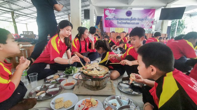 สำหรับช่วงกลางวันได้จัดกิจกรรม “สมาคมสื่อสารมวลชนสุโขทัย ปันสุข อิ่มบุญ” จัดเลี้ยงอาหารกลางวัน (หมูกระทะและพิซซ่า) ให้กับนักเรียนโรงเรียนบ้านธารชะอม ตำบลไทยชนะศึก อำเภอทุ่งเสลี่ยม จังหวัดสุโขทัย โดยมี นายปพน สอนธรรม นายอำเภอทุ่งเสลี่ยม ร่วมกิจกรรม