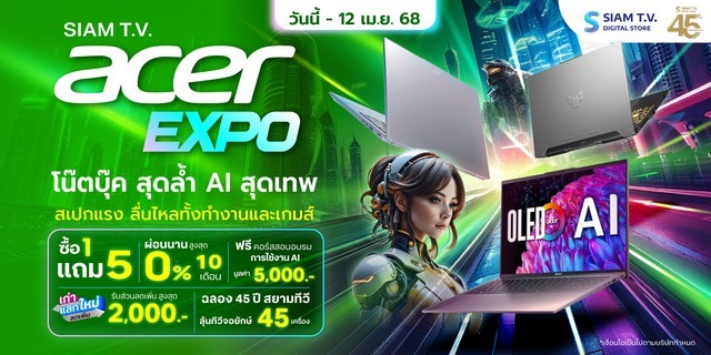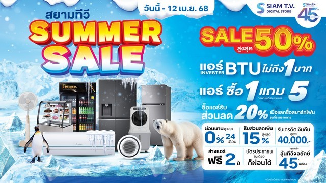 แล้วพบกันในงาน สยามทีวี Mobile & IT EXPO 2025 ตั้งแต่วันที่ 1 มีนาคม ถึง 12 เมษายน 2568 นี้ ที่สยามทีวีทั้ง 4 สาขา เชียงใหม่ลำพูน ลำปาง จอมทอง ทั้งนี้ ทุกใบเสร็จ ร่วมกิจกรรม สยามทีวี 45 ปี ลุ้นรับสมาร์ททีวีจอใหญ่ยักษ์ 45 เครื่อง มูลค่ากว่า 4 แสนบาท