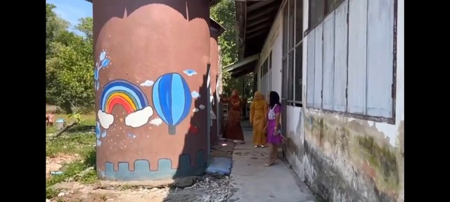 คุณครู กล่าวว่า เริ่มต้นห้องน้ำเป็น แท้งค์น้ำปูนที่ไม่ใช้แล้ว ท่าน ผอ.ก็มีโครงการที่อยากจะเปลี่ยนแปลงของห้องน้ำ ก็เลยเอาแท้งค์น้ำมาเป็นห้องน้ำ ซึ่งห้องน้ำทำมานานแล้ว ทางโรงเรียนมีความคิดว่า ให้เด็กมาใช้ห้องน้ำแล้วมีความสุขภายในบรรยากาศที่อยู่ใต้ท้องทะเล ได้มานั่งสัมผัสบรรยากาศเพราะว่าเหมือนอย่างห้องน้ำอย่างที่บอก คือเหมือนปล่อยทุกข์ แต่ว่าไม่ทุกข์ แต่มีความสุข ที่ได้ชมทัศนียภาพภายใต้ท้องทะเลเป็นเหมือนอควาเรียม ชาวบ้านที่มาเห็นต่างพากันชื่นชอบ