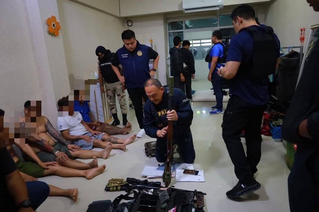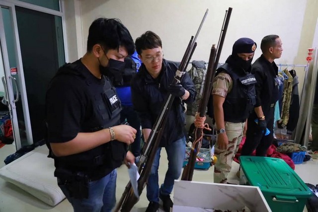 โดยเมื่อเจ้าหน้าที่เข้าตรวจค้นได้แสดงหมายค้น และได้ตรวจพบนายเรืองชาติ ไชยบุตร อายุ 35 ปี พร้อมพวกอีก 5 คน อยู่ในอาคารพาณิชย์ดังกล่าว จึงได้ควบคุมตัวบุคคลทั้งหมดและให้นำตรวจค้น โดยเบื้องต้นได้ตรวจพบอาวุธปืน จำนวน 17 กระบอก เป็นปืนสั้นขนาด 9 มม. จำนวน 2 กระบอก /ขนาด 11 มม. จำนวน 1 กระบอก /ลูกโม่ .357 จำนวน 1 กระบอก/ปืนยาว ขนาด .22 จำนวน 3 กระบอก /ลูกซอง จำนวน 2 กระบอก /และปืนแก็ป จำนวน 8 กระบอก /เครื่องกระสุนขนาดต่างๆ จำนวนมากกว่า 500 นัด /อุปกรณ์ลดเสียง/กล้องติดอาวุธปืน /ซากสัตว์/ซากศพ (กะโหลกศีรษะมนุษย์) จึงได้ตรวจยึดของกลางทั้งหมด เบื้องต้น ได้อายัดของกลางทั้งหมดไว้ตรวจสอบและแจ้งข้อกล่าวหา1.ร่วมกันครอบครองอาวุธปืนและเครื่องกระสุนโดยไม่ได้รับอนุญาต 2.ร่วมกันครอบครองซากสัตว์โดยไม่ได้รับอนุญาต 3.ร่วมกับครอบครองซากศพโดยผิดกฎหมาย