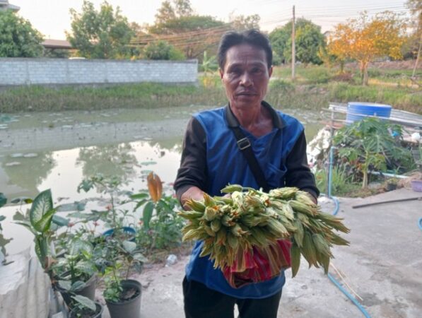 “สำหรับดอกฟักทองนั้น นิยมลวกจิ้มน้ำพริก หรือเป็นเครื่องเคียงต้มซุป แกงอ่อม รสชาติหวาน มัน อร่อย โดยจะเก็บดอกตัวผู้ไปขายในหมู่บ้าน 30 ดอก/มัด ขายมัดละ 10 บาท มีรายได้วันละ 200-300 บาท ส่วนผลนิยมเก็บผลแก่ขายในราคา กก.ละ 15 บาท หรือบรรจุถุงขายถุงละ 10 กก.ราคา 150 บาท ข้าวโพดก็ขายทั้งฝักดิบและต้มสุก 3 ฝักราคา 20 บาท หรือแล้วแต่จะตกลงกันได้ หากปีนี้ได้กำไรดี ฤดูแล้งปีหน้าก็จะขยายพื้นที่ปลูกเพิ่มอีก และเพิ่มชนิดพืชผักให้มีความหลากหลายมากขึ้น เพราะเห็นแล้วว่าทำง่าย ไม่ยุ่งยาก ได้อยู่กับครอบครัว” นายสมจิตรกล่าว