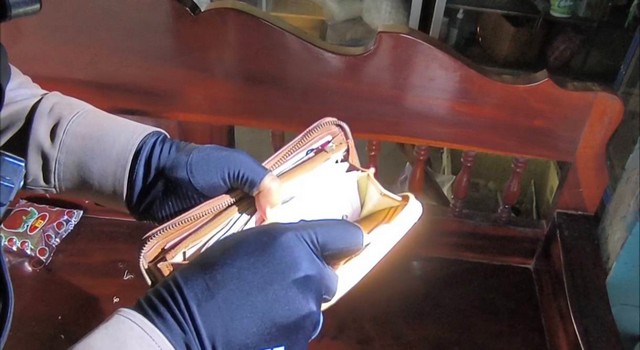 พบว่ามีกระเป๋าหนังสีน้ำตาลแบบสะพายของผู้หญิง จึงได้เปิดดูพบว่ามีเงินสดจำนวนกว่าหมื่นบาท สร้อยทอง บัตรประชาชนชื่อนางอุ่นเรื่อน (ขอสงวนนามสกุล) เป็นคนอำเภอบ้านนา จังหวัดนครนายก และบัตรเอกสารอีกหลายรายการ เจ้าหน้าที่ตำรวจได้ถ่ายภาพไว้เป็นหลักฐาน และได้นำไปส่งร้อยเวรที่สถานีตำรวจภูธรเมืองนครนายก เพื่อติดตามตัวเจ้าของกระเป๋ามารับคืนต่อไป