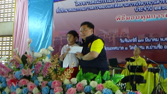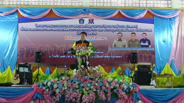 โครงการคณะกรรมการตรวจสอบและติดตามการบริหารงานตำรวจจังหวัด อ่างทอง /ที่ปรึกษาคณะกรรมการตรวจสอบและติดตามการบริหารงานตำรวจจังหวัดอ่างทอง ตำรวจภูธรจังหวัดอ่างทอง ห่วงใยเยาวชน ยังได้มอบทุนการศึกษาให้แก่นักเรียน จำนวน 24 ทุนๆละ 2,000 บาท และมอบข้าวสาร อาหารแห้ง ให้นักเรียนที่ขาดแคลนอีกด้วย พร้อมกันนั้นคณะยังได้เลี้ยงอาหารกลางวัน พร้อมน้ำดื่ม ขนม ไอศกรีม นักเรียนทั้ง 481 คนด้วย