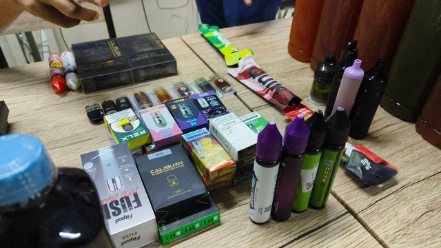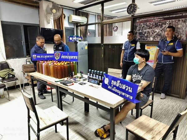 พร้อมด้วยของกลางและสิ่งของที่ใช้เป็นพยานหลักฐาน ประกอบด้วย 1. บุหรี่ไฟฟ้ายี่ท้อ CALIBURN จำนวน 2 เครื่อง (ได้จากการล่อซื้อ) 2. หัวเชื้อน้ำยาบุหรี่ไฟฟ้าขวดสีขาว-ม่วง จำนวน 1 ขวด (ได้จากการล่อซื้อ) 3.หัวเชื้อน้ำยาบุหรี่ไฟฟ้าขวดสีแดง จำนวน 1 ขวด (ได้จากการล่อ) 4. ธนบัตรที่ใช้ในการล่อซื้อ ธนบัตรใบละ 100 บาท จำนวน 6 ใบ 5.หัวเชื้อน้ำยาบุหรี่ไฟฟ้าจำนวน 4 ขวด (ได้จากการตรวจค้น) 6.บุหรี่ไฟฟ้าแบบสูบทิ้งจำนวน 8 ชิ้น (ได้จากการตรวจค้น) 7. หัวเชื้อน้ำอาบุหรี่ไฟฟ้าแบบเปลี่ยนหัว จำนวน 29 ชิ้น 8.คอยด์บุหรี่ไฟฟ้า จำนวน ๔ ชิ้น (ได้จากการตรวจค้น) 9.หัวเชื้อสำหรับผสมน้ำกระท่อมยี่ห้อเอคอล ขวดใหญ่ จำนวน 6 ขวด (ได้จากการตรวจค้น) 10.หัวเชื้อสำหรับผสมน้ำกระท่อมยี่ห้อเอคอล ขวดเล็กจำนวน 7 ชวด (ได้จากการตรวจค้น) 11.น้ำกระท่อมบรรจุขวด 1,000 มล. จำนวน 72 ขวด (ใต้จากการตรวจค้น)