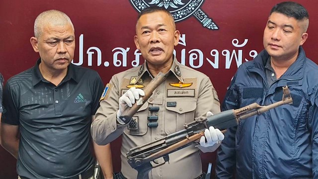พังงา-ผู้การฯแถลงตำรวจตั้งด่านค้นพบปืนสงคราม 4 กระบอก คุมตัวผู้ต้องหาสอบเข้มขยายผลต้นทางไปยังปลายทาง
