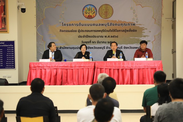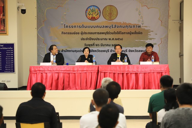 วันที่ 26 มีนาคม 2568 เวลา 09.30 น ที่ สำนักงานคุมประพฤติจังหวัดลพบุรี นายปรัชญา เปปะตัง รองผู้ว่าราชการจังหวัดลพบุรี เป็นประธานเปิด โครงการต้นแบบคนลพบุรี สังคมคุณภาพ กิจกรรม ผู้ประกอบการลพบุรีร่วมใจให้โอกาสผู้พลั้งผิด ให้มีอาชีพ มีรายได้ รุ่นที่ 4 โดยมี นางละอองทิพย์ ปนัดสาโก ผู้อำนวยการสำนักงานคุมประพฤติจังหวัดลพบุรี หัวหน้าส่วนราชการ ผู้แทนจากหน่วยงานต่าง ๆ วิทยากร และผู้ถูกคุมความประพฤติ ในความดูแลของสำนักงานควบคุมความประพฤติ เข้าร่วมกิจกรรม