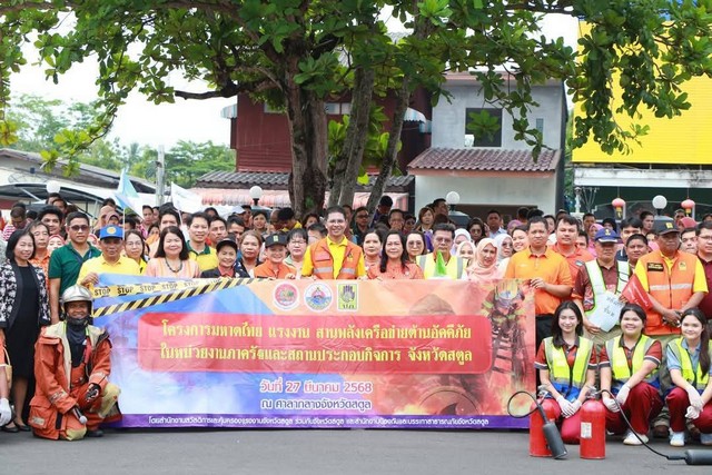 วันนี้ 27 มี.ค. 68 ที่ห้องประชุมโต๊ะพญาวัง ชั้น 4 ศาลากลางจังหวัดสตูล นายศักระ กปิลกาญจน์ ผู้ว่าราชการจังหวัดสตูล มอบหมายให้ นายคณิต คงช่วย รองผู้ว่าราชการจังหวัดสตูล เป็นประธานการอบรมดับเพลิงและอพยพหนีไฟ ในพื้นที่ศาลากลางจังหวัด เพื่อเสริมสร้างความรู้ความเข้าใจในการป้องกันและรับมือกับเหตุเพลิงไหม้ให้กับบุคลากรภายในศาลากลาง โดยการฝึกอบรมในช่วงเช้า เริ่มต้นด้วยการให้ความรู้เกี่ยวกับหลักการดับเพลิงเบื้องต้น การใช้อุปกรณ์ดับเพลิงอย่างถูกต้อง และแนวทางปฏิบัติเมื่อเกิดเหตุฉุกเฉิน เช่น วิธีการแจ้งเหตุ การประเมินสถานการณ์ และการอพยพอย่างปลอดภัย โดยมีวิทยากรผู้เชี่ยวชาญ รวมถึงหน่วยงานที่เกี่ยวข้องร่วมให้ความรู้ โดยมีหัวหน้าส่วนราชการ ภาคเอกชน และผู้เกี่ยวข้องเข้าร่วม