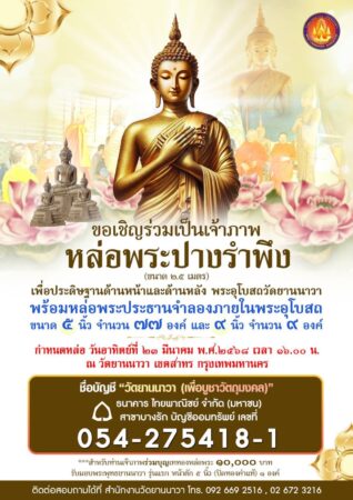 ทั้งนี้ “พระพุทธยานนาวา” ประดิษฐานเป็นพระประธานในพระอุโบสถวัดยานนาวา ที่มีความเก่าแก่นับแต่สมัยรัชกาลที่ 1 โปรดฯให้สร้างพระอุโบสถใหม่ขึ้นจากวัดเดิมนับแต่ครั้งสมัยอยุธยา ตอนปลายโดย “พระพุทธยานนาวา” เป็นพระพุทธรูปปางสมาธิ สูง 4 ศอก 10 นิ้ว และองค์จำลองรวม 86 องค์ ขนาด 5นิ้ว (77องค์) ขนาด 9 นิ้ว ( 9 องค์) กำหนดหล่อแล้วเสร็จในพิธีเททองหล่อพระปางรำพึงเมื่อวันที่ 23 มีนาคม 2568 ที่ผ่านมา