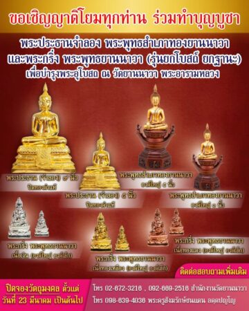 สนใจติดต่อสอบถามเพิ่มเติม 1. สำนักงานวัดยานนาวา โทร. 092-669-2516 2. พระครูสังฆรักษ์ชนแดน อคฺคปญฺโญ โทร. 098-639-4036 3. เพจ. วัดยานนาวา พระอารามหลวง