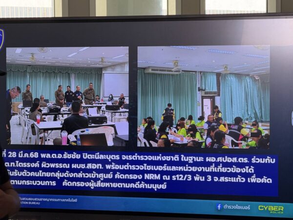 วันนี้ (1 เมษายน 2568) เวลา 16.00 น. พล.ต.อ.ธัชชัย ปิตะนีละบุตร จเรตำรวจแห่งชาติ ในฐานะผู้อำนวยการศูนย์ปราบปรามอาชญากรรมทางเทคโนโลยีสารสนเทศ สำนักงานตำรวจแห่งชาติ และผู้อำนวยการศูนย์ต่อต้านการค้ามนุษย์ สำนักงานตำรวจแห่งชาติ (จตช./ผอ.ศปอส.ตร./ผอ.ศตคม.ตร.) พร้อมด้วย นายเทพสุ บวรโชติดารา เลขาธิการคณะกรรมการป้องกันและปราบปรามการฟอกเงิน , พล.ต.ท.ไตรรงค์ ผิวพรรณ ผู้บัญชาการตำรวจสืบสวนสอบสวนอาชญากรรมทางเทคโนโลยี (ผบช.สอท.) , พล.ต.ต.อรรถสิทธิ์ สุดสงวน รอง ผบช.สอท. , พล.ต.ต.พงษ์สยาม มีขันทอง รอง ผบช.ทท. , พล.ต.ต.ทินกร รังมาตย์ รอง ผบช.สอท. , พล.ต.ต. ศรายุทธ จุณณวัตต์ ผบก.สอท.2 , พล.ต.ต.ธีระชัย ชำนาญหมอ ผบก.สส.ภ.2 , พ.ต.อ.เพลิน กลิ่นพยอม รอง ผบก.ตม.3. และ พ.ต.อ.ไกลเขต บุรีรักษ์ รอง ผบก.ภ.จว.สระแก้ว แถลงผลปฏิบัติการกวาดล้างแก๊งคอลเซ็นเตอร์ รับตัวคนไทย 56 คน จากเมืองปอยเปต ประเทศกัมพูชา มาดำเนินคดีในไทย พบเชื่อมโยงแก๊งคอลเซ็นเตอร์ 1,154 คดี สร้างความเสียหายให้เพื่อนร่วมชาติแล้วกว่า 709 ล้านบาท ณ บริเวณชั้น 1 บก.สอท.2 เมืองทองธานี