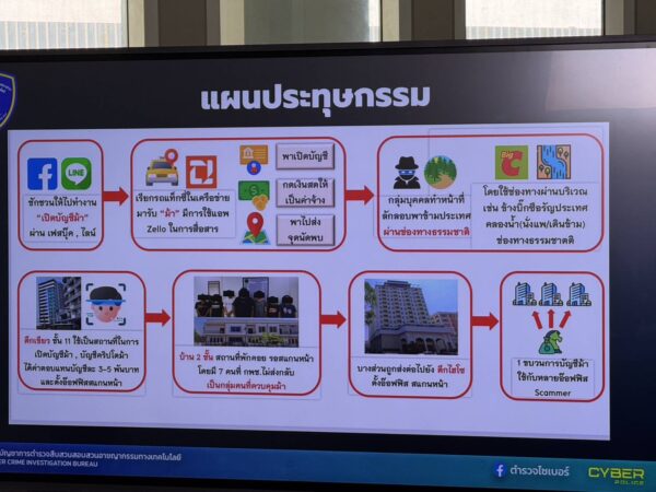 โดยผู้ต้องหาส่วนใหญ่มีพฤติการณ์ในลักษณะคล้ายกันคือ เริ่มต้นจากการถูกชักชวนผ่านสื่อโซเชียลให้ไปทำงาน จากนั้นได้ถูกพาไปเปิดบัญชีธนาคารโดยรับค่าจ้างประมาณ 3-5 พันบาทต่อบัญชี และเดินทางข้ามชายแดนผ่านช่องทางธรรมชาติไปฝั่งปอยเปต พักคอยเพื่อรอสแกนหน้าในการโอนเงินให้แก๊งคอลเซ็นเตอร์ จากการสอบถามหนึ่งในผู้ต้องหา ให้การว่า ขบวนการแก๊งคอลเซ็นเตอร์ดังกล่าวได้มีการรวบรวมม้ารับจ้างเปิดบัญชี โดยจะมีรถมารับถึงที่บ้านไม่เสียค่าใช้จ่ายแต่อย่างใด แล้วนำพาข้ามแดนโดยผิดกฎหมาย ก่อนจะให้ไปอยู่รวมกันที่ตึกทาวน์เฮาส์ 2 ชั้น ที่เมืองปอยเปต สถานที่ดังกล่าวมีการจัดแบ่งพื้นที่พักอาศัย แยกตามเพศชายและหญิง ภายในบ้านมีการจัดเตรียมฟูกสำหรับการพักอาศัย รวมถึงมีการจัดหาอาหารให้ โดยผู้รับจ้างจะต้องเปิดบัญชีธนาคารออนไลน์และบัญชีทรัพย์สินดิจิทัล เพื่อใช้ในการถ่ายเททรัพย์สินของแก๊งคอลเซ็นเตอร์