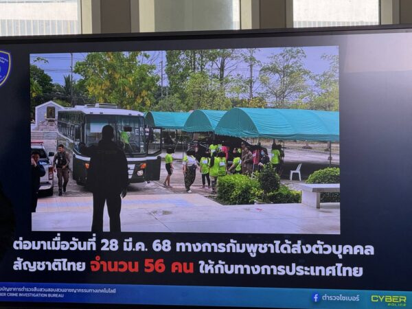 วันนี้ (1 เมษายน 2568) เวลา 16.00 น. พล.ต.อ.ธัชชัย ปิตะนีละบุตร จเรตำรวจแห่งชาติ ในฐานะผู้อำนวยการศูนย์ปราบปรามอาชญากรรมทางเทคโนโลยีสารสนเทศ สำนักงานตำรวจแห่งชาติ และผู้อำนวยการศูนย์ต่อต้านการค้ามนุษย์ สำนักงานตำรวจแห่งชาติ (จตช./ผอ.ศปอส.ตร./ผอ.ศตคม.ตร.) พร้อมด้วย นายเทพสุ บวรโชติดารา เลขาธิการคณะกรรมการป้องกันและปราบปรามการฟอกเงิน , พล.ต.ท.ไตรรงค์ ผิวพรรณ ผู้บัญชาการตำรวจสืบสวนสอบสวนอาชญากรรมทางเทคโนโลยี (ผบช.สอท.) , พล.ต.ต.อรรถสิทธิ์ สุดสงวน รอง ผบช.สอท. , พล.ต.ต.พงษ์สยาม มีขันทอง รอง ผบช.ทท. , พล.ต.ต.ทินกร รังมาตย์ รอง ผบช.สอท. , พล.ต.ต. ศรายุทธ จุณณวัตต์ ผบก.สอท.2 , พล.ต.ต.ธีระชัย ชำนาญหมอ ผบก.สส.ภ.2 , พ.ต.อ.เพลิน กลิ่นพยอม รอง ผบก.ตม.3. และ พ.ต.อ.ไกลเขต บุรีรักษ์ รอง ผบก.ภ.จว.สระแก้ว แถลงผลปฏิบัติการกวาดล้างแก๊งคอลเซ็นเตอร์ รับตัวคนไทย 56 คน จากเมืองปอยเปต ประเทศกัมพูชา มาดำเนินคดีในไทย พบเชื่อมโยงแก๊งคอลเซ็นเตอร์ 1,154 คดี สร้างความเสียหายให้เพื่อนร่วมชาติแล้วกว่า 709 ล้านบาท ณ บริเวณชั้น 1 บก.สอท.2 เมืองทองธานี
