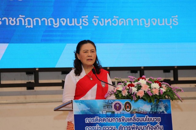 ผู้ช่วยศาสตราจารย์ ดร.พจนีย์ สุขชาวนา อธิการบดีมหาวิทยาลัยราชภัฏกาญจนบุรี กล่าวถึง นโยบายตามยุทธศาสตร์มหาวิทยาลัยเพื่อการพัฒนาท้องถิ่นอย่างยั่งยืนว่า มหาวิทยาลัยราชภัฏกาญจนบุรี อว.ส่วนหน้าจังหวัดกาญจนบุรี มุ่งมั่นที่จะสนับสนุนนโยบายของกระทรวงในการพัฒนากำลังคนที่มีศักยภาพสูง สร้างองค์ความรู้และนวัตกรรมเพื่อตอบโจทย์ความท้าทายในศตวรรษที่ 21 ในยุคปัจจุบัน และร่วมขับเคลื่อนการพัฒนาประเทศไทยสู่ความมั่นคง มั่งคั่ง และยั่งยืน ยกระดับคุณภาพชีวิตชุมชนท้องถิ่นในทุกมิติ
