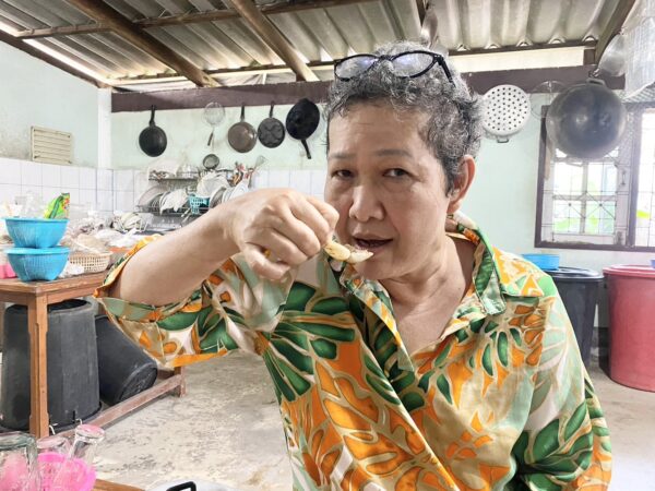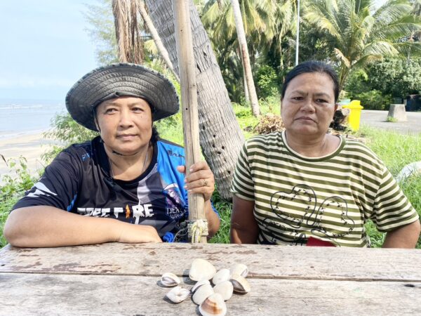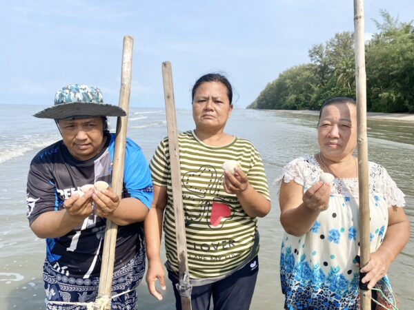 นางดวงพร ขันนาก อายุ 56 ปี ชาวบ้าน บ้านตาหนึก บอกว่าได้ลงมาหน้าหาดเพื่อหาหอยขาวตามที่ลูกค้าสั่ง นางดวงพรเลยได้พาเพื่อนบ้านไปทำการคาดหอยกันหลายคน เพื่อที่จะนำไปขาย ที่เหลือก็จะทำอาหารกินเอง และได้นําหอยขาวไปขายให้นางฐิติรัตน์ เป็นประธานกลุ่มวิสาหกิจชุมชนแปรรูปอาหารทะเลบ้านตาหนึก นางฐิติรัตน์จึงได้นําหอยขาวที่ซื้อมาไปทําเมนูอาหารพื้นบ้าน เช่น นําไปต้มยําและผัดเผ็ดใส่ใบโหระพา หลังทําเสร็จก็ตักมานั่งกินคนเดียว เคี้ยวไปเคี้ยวมา รู้สึกเหมือนว่ามีเม็ดอะไรแข็งๆจึงคายออกมาดู