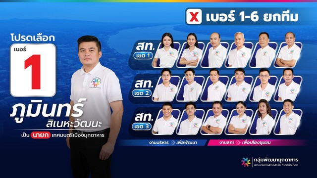 กลุ่มพัฒนามุกดาหาร หมายเลข 1 นายภูมินทร์ สิเนหะวัฒนะ ผู้สมัครว่าที่นายกเทศมนตรีเมือง ผู้สมัคร ส.ท. เบอร์ 1-6 ทั้ง 3 เขต