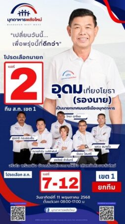กลุ่มมุกดาหารพลังใหม่ หมายเลข 2 นายอุดม เที่ยงโยธา ผู้สมัครว่าที่นายกเทศมนตรีเมือง ผู้สมัคร ส.ท. เบอร์ 7-12 ทั้ง 3 เขต
