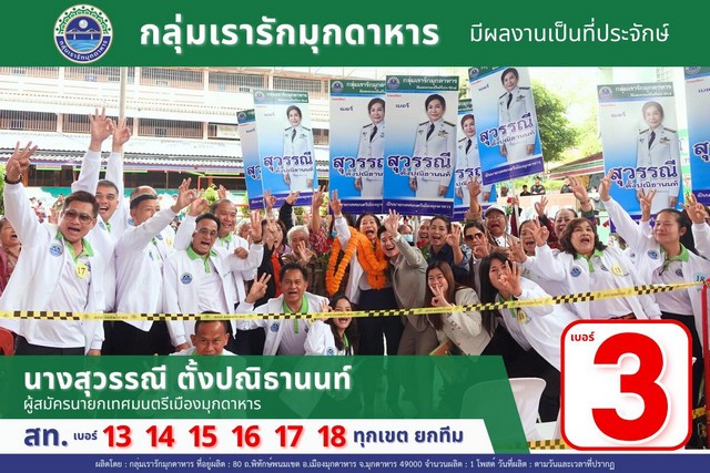 กลุ่มเรารักมุกดาหาร หมายเลข 3 นางสุวรรณี ตั้งปณิธานนท์ ผู้สมัครว่าที่นายกเทศมนตรีเมือง ผู้สมัคร ส.ท. 13-18 ทั้ง 3 เขต