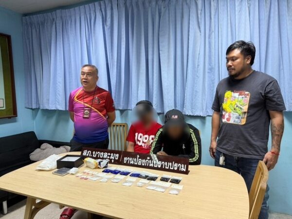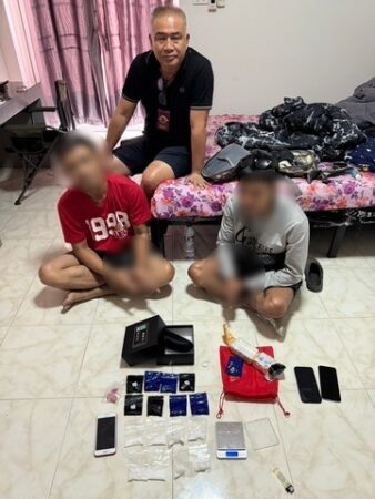 เมื่อเวลา 22.36 น.วันที่ 6 เมษายน 2568 พ.ต.อ.สราวุธ นุชนารถ ผกก.สภ.บางละมุง พ.ต.ท.กรณ์พงษ์ สุขวิสิฏฐ์ รอง ผกก.สส.สภ.บางละมุง ร.ต.ท.ธงธวัช พลละคร รอง สว.สส.สภ.บางละมุง (ชุดปฏิบัติการพิเศษ) พร้อมชุดสืบสวน สภ.บางละมุง ร่วมกันจับกุมผู้ต้องหาคดียาเสพติดสองราย ทราบชื่อคือ นาย อนุสรณ์ (สงวนนามสกุล) อายุ 29 ปี นาย สืบชาติ (สงวนนามสกุล) อายุ 32 ปี พร้อมของกลางเป็นยาเสพติดประเภทที่หนึ่ง ยาบ้า จำนวน 5,411 เม็ด ไอซ์หนัก 71.80 กรัม โดยสามารถจับกุมได้ที่ห้องพักแห่งหนึ่งในพื้นที่แหลมฉบัง ต.ทุ่งสุขลา อ.ศรีราชา จ.ชลบุรี
