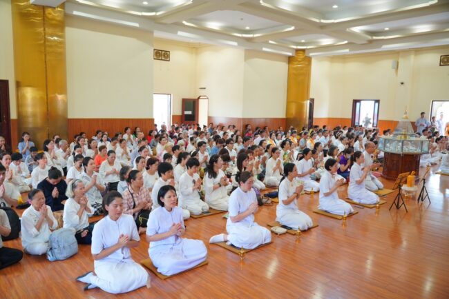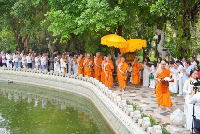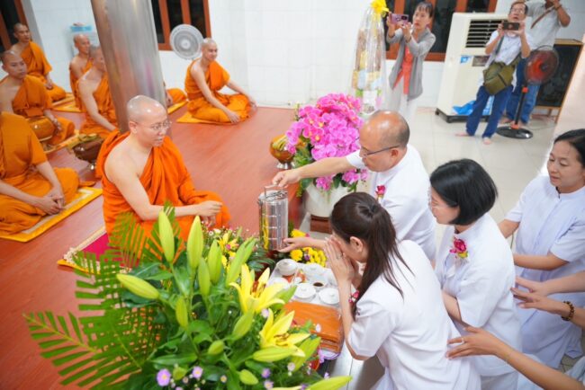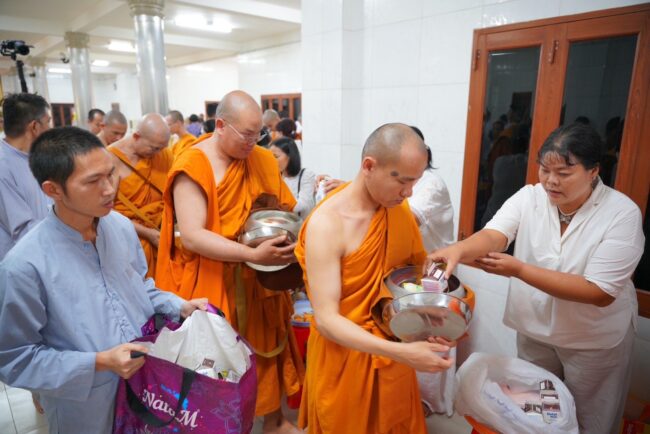จากนั้นเป็นพิธีกล่าวถวายพระบรมสารีริกธาตุ โดย กัลฯ อภิสิทธิ์ วิศิษฎ์วรพร เป็นผู้แทนกล่าวคำถวายเป็นภาษาบาลี และกัลฯ ประภาศรี จันทะขันตี เป็นผู้แทนกล่าวคำถวายเป็นภาษาไทย ต่อด้วย พระราชวิเทศวชิรเวที อัญเชิญพระบรมสารีริกาธาตุ พร้อมของบริวารถวายแด่พระมหาเถระ เวียน มินห์ Vien Minh ท่านประธานสงฆ์ ตามด้วยท่านประธานสงฆ์กล่าวสัมโมทนียกาถา และนำคณะสงฆ์ให้พรและแผ่เมตตา การนี้ คณะศิษยานุศิษย์ พร้อมด้วยเจ้าภาพ และสาธุชนทั้งประเทศเวียดนามและไทย ได้มีโอกาสทำบุญตักบาตรคณะสงฆ์เวียดนาม – ไทย นับเป็นการเชื่อมสายสัมพันธ์ทางพระพุทธศาสนาระหว่างไทย เวียดนามอีกด้วย