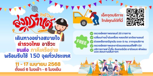 ทั้งนี้ กิจกรรมอาชีวะ-ขนส่ง อาสาช่วยประชาชน เทศกาลสงกรานต์ 2568 “สงกรานต์ปลอดภัย เดินทางไปไหนก็มีความสุข” จัดขึ้นระหว่างวันที่ 11 – 17 เมษายน 2568 เวลา 06.00 – 18.00 น. จำนวน 150 จุด ทั่วประเทศ โดยมีบริการตรวจเช็คสภาพรถยนต์ 20 รายการ , เปลี่ยนถ่ายน้ำมันเครื่อง หลอดไฟ รถจักรยานยนต์ , ช่วยเหลือกรณีฉุกเฉินระยะ 5 กิโลเมตรจากจุดบริการ , ตรวจเช็คสภาพและชาร์จแบตเตอรี่รถยนต์ไฟฟ้า EV , บริการกาแฟ น้ำดื่ม อินเทอร์เน็ต ชาร์จแบต พักผ่อน นวด สอบถามเส้นทาง ฯลฯ อีกด้วย โดยประชาชนผู้ขับขี่ยานพาหนะสามารถค้นหาจุดบริการทั้ง 150 จุด ได้ที่เว็บไซต์ https://vecrsa.vec.go.th