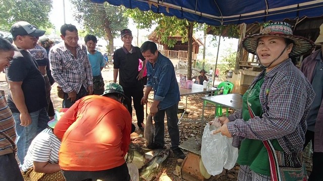 ซึ่งบรรยากาศเปิดสระจับปลาในครั้งนี้ มีชาวบ้านและเซียนแห เข้าร่วมประชันฝีมือ ไม่น้อยกว่า 100 คน แต่ละคน ก็นำอุปกรณ์หาปลาที่ถนัด ทั้งแห ยอ สวิง ลุยน้ำจับปลากันอย่างคึกคัก ซึ่งทุกคน ก็ต่างไม่ผิดหวัง สามารถจับปลากันได้ทุกคน ได้มากบ้าง น้อยบ้าง ตามความสามารถ โดยปลาที่จับได้ ก็มีทั้ง ปลาบึก ปลาช่อน ปลานิล ปลาตะเพียน ปลาขาว ปลาหมอ โดยเฉพาะปลาบึก พบว่าแต่ละตัวก็มีขนาดใหญ่ น้ำหนักราว 15-25 กิโลกรัมต่อตัวเลยทีเดียว บางคนหว่านแหได้ถึง100กว่า กิโลกรัม ขายเพียงกิโลกรัมละ50บาท จนชาวบ้านที่มาดูการหว่านแหครั้งนี้ อดไม่ได้ และ พ่อค้าแม่ค้า ถึงกับติดต่อขอซื้อสดๆจากปากบ่อเลยทีเดียว สร้างรายได้ให้กับเซียนแห ได้อีกด้วย