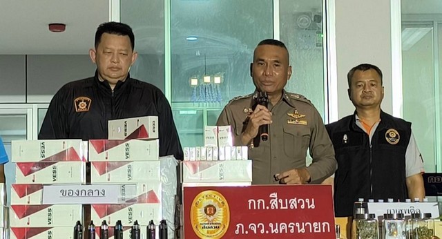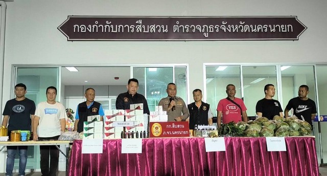 นครนายก ภาพเหตุการณ์ รวบโรงผลิตน้ำกระท่อมสาขาสองพบเปิดร้านพัสดุรับบุหรี่จากใต้มาขาย