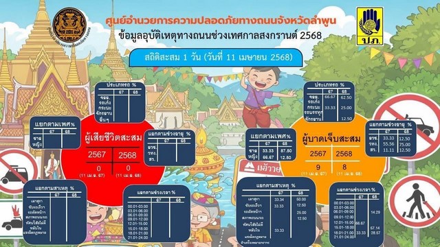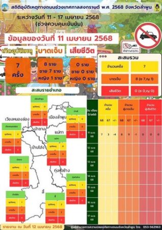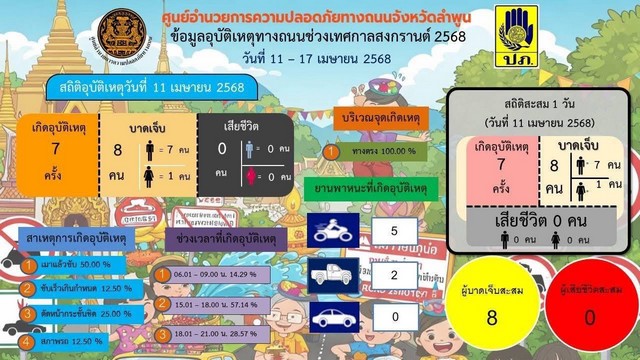 สำหรับสถิติการเกิดอุบัติเหตุช่วงเทศกาลสงกรานต์วันแรก (11 เมษายน 2568) จังหวัดลำพูน เกิดอุบัติเหตุ จำนวน 7 ครั้ง ในพื้นที่ อ.ลี้ และ อ.เวียงหนองหนองล่อง อำเภอละ 2 ครั้ง อ.ป่าซาง อ.ทุ่งหัวช้าง และ อ.โฮ่ง อำเภอละ 1 ครั้ง มีผู้บาดเจ็บ จำนวน 8 คน แยกเป็นชาย 7 คน หญิง 1 คน โดย อ.เวียงหนองล่อง มีจำนวนผู้บาดเจ็บ 3 คน อ.ลี้ จำนวน 2 คน อ.ป่าซาง อ.ทุ่งหัวช้าง และ อ.บ้านโฮ่ง อำเภอละ 1 คน