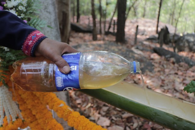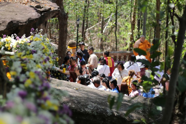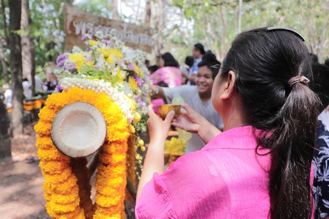 โดยมีพระอาจารย์ณรงค์ ชยมงฺคโล เจ้าอาวาสวัดพุทธนิมิต (ภูค่าว) ได้นำคณะสงฆ์ประกอบพิธีขอขมาพระพุทธไสยาสน์ หรือพระนอน ซึ่งเป็นพระพุทธรูปตะแคงซ้ายที่มีอายุกว่า 2,000 ปี จากนั้นจึงให้ชาวบ้านได้สรงน้ำพระนอนผ่านรางไม้ไผ่ พร้อมประดับตกแต่งด้วยดอกไม้สดอย่างสวยงาม โดยรูปแบบของพิธีสรงน้ำยังคงไว้ตามแบบโบราณที่สืบสานกันมาอย่างยาวนาน
