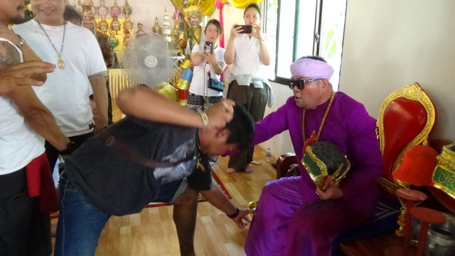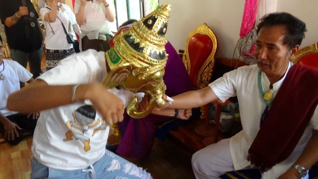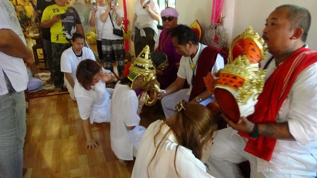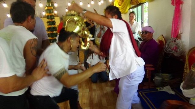 เมื่อถึงเวลาหลังจากนั้นได้มีการครอบเศียรครู ช่วงระหว่างทำพิธีได้มีลูกศิษย์ของขึ้น องค์ลง ซึ่งมีเจ้าหน้าที่ช่วยกันจับไว้ เพื่อป้องกันไม่ให้เกิดอันตรายแก่คนอื่นที่มาร่วมงาน ท่ามกลางบรรยากาศอัศจรรย์ กับปรากฏการณ์ของขึ้นของบรรดาศิษยานุศิษย์ทั้ง หญิง ชาย ทำให้ต้องช่วยกันจับ