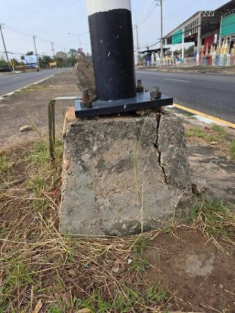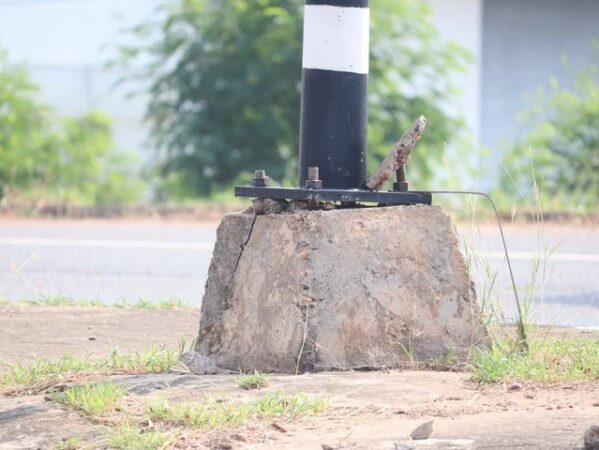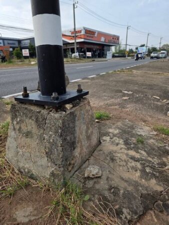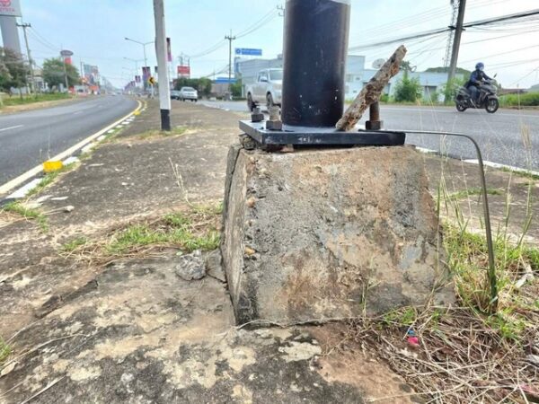มุกดาหาร​-ช็อค! เสาทางหลวงมุกดาหารจุดเสี่ยงภัยสุดๆ ใช้เศษปูนยัดรองให้เสาตรง หวั่นเกิดอันตรายเนื่องจากเป็นถนนสายหลักของจังหวัด