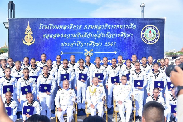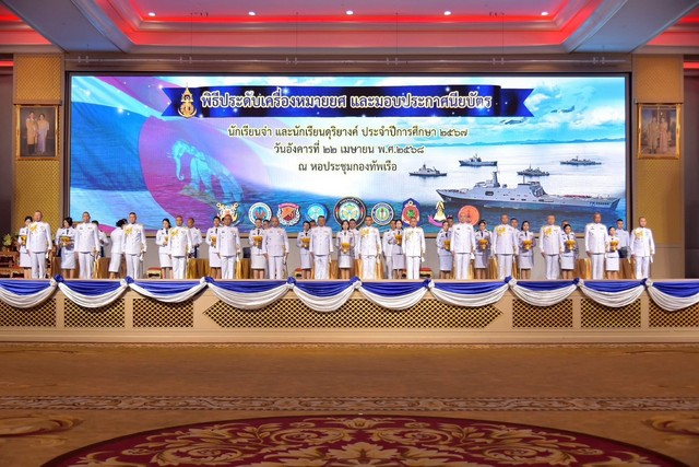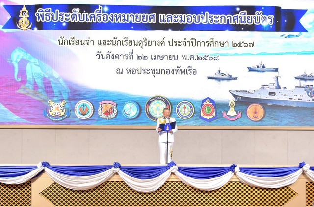 วันที่ 22 เมษายน 2568 เวลา 14.30 น. พลเรือเอก จิรพล ว่องวิทย์ ผู้บัญชาการทหารเรือ เป็นประธานในพิธีประดับเครื่องหมายยศ และมอบประกาศนียบัตรให้แก่ นักเรียนจ่า (นรจ.) และนักเรียนดุริยางค์ (นดย.) ที่สำเร็จการศึกษาประจำปี 2567 จากโรงเรียนชุมพลทหารเรือ โรงเรียนสื่อสารและเทคโนโลยีสารสนเทศ โรงเรียนทหารนาวิกโยธิน โรงเรียนอิเล็กทรอนิกส์ โรงเรียนพลาธิการ โรงเรียนนาวิกเวชกิจ โรงเรียนการขนส่งทหารเรือ และโรงเรียนดุริยางค์ กองดุริยางค์ทหารเรือ ณ ห้องเจ้าพระยา หอประชุมกองทัพเรือ เขตบางกอกใหญ่ กรุงเทพมหานคร
