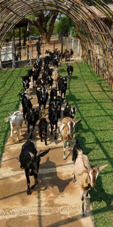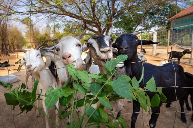 หญ้าแพงโกล่า, หญ้าเนเปียร์ และ ต้นถั่วมะแฮะ โดยได้รับความร่วมมือและการสนับสนุนจาก บริษัท ปตท. สำรวจและผลิตปิโตรเลียม จำกัด (มหาชน) โดยได้เริ่มทำการก่อสร้างโรงเรือน เมื่อวันที่ 22 เมษายน 2560 แล้วเสร็จเมื่อวันที่ 2 กรกฎาคม 2560 หลังจากนั้นได้เดินทางไปรับพันธุ์แพะพระราชทานผ่านมูลนิธิชัยพัฒนา จังหวัดเชียงราย จำนวน 50 ตัว เป็นแพะพันธุ์แบล็คเบงกอล 20 ตัว แยกเป็นเพศเมีย 10 ตัว, เพศผู้ 10 ตัว และพันธุ์ผสมจำนวน 30 ตัว แยกเป็นเพศเมีย 10 ตัว เพศผู้ 20 ตัว และรับแพะจากกรมปศุสัตว์ จังหวัดมหาสารคาม เพศเมีย 10 ตัว ปัจจุบัน โครงการฯ มียอดแพะจำนวนทั้งสิ้น 134 ตัว แยกเป็นเพศผู้ 45 ตัว และ เพศเมีย 89 ตัว (สายพันธุ์แบล็คเบงกอล 80 ตัว, สายพันธุ์บอร์ 9 ตัว และสายพันธุ์ผสม 45 ตัว)