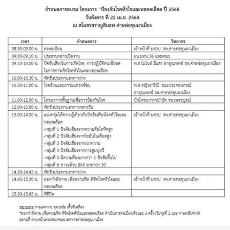 โรงพยาบาลค่ายพ่อขุนผาเมือง ได้ริเริ่มในการจัดการประชุมวิชาการ และการอบรมโครงการ “ป้องกันโรคหัวใจและหลอดเลือด ปี 2568” ขึ้น ในวันอังคารที่ 22 เมษายน 2568 ณ สโมสรสราญสินธพ ค่ายพ่อขุนผาเมือง จังหวัดเพชรบูรณ์ โดยมีหัวข้อการอบรมฯ ดังนี้ 1) ปัจจัยเสี่ยงในการเกิดโรค, การปฏิบัติตนเพื่อลดโอกาสการเกิดโรคหัวใจและหลอดเลือด 2) โรคอ้วนและภาวะแทรกซ้อน 3) โภชนาการพื้นฐานเพื่อการป้องกันโรค 4) แบ่งกลุ่มให้ความรู้เกี่ยวกับปัจจัยเสี่ยงโรคหัวใจ และหลอดเลือด 6 กลุ่มเสี่ยง และ 5) การออกกำลังกาย เพื่อความฟิต พิชิตโรคหัวใจและหลอดเลือด ทั้งนี้หากมีผู้สนใจในเรื่องดังกล่าว สามารถเข้าร่วมกิจกรรมฯ และประสานงานสอบถามปรึกษาได้ฟรี ไม่มีค่าใช้จ่าย