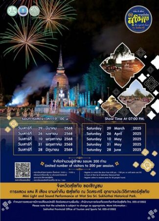 กิจกรรมชมฟรี การแสดงแสงเสียง เล่าเรื่องเมืองสุโขทัย Mini Light&Sound ณ วัดสระศรี อุทยานประวัติศาสตร์สุโขทัย ซึ่ง กำหนดให้นักท่องเที่ยวเข้าชมฟรี ทั้งหมด 5รอบ โดยครั้งนี้จัดในวันที่ 26 เมษายน 2568 เป็นรอบที่ 2 และจนถึงเดือนมิถุนายน เพื่อให้การท่องเที่ยวในจังหวัดและแหล่งท่องเที่ยวได้รับความสนใจเดินทางมาท่องเที่ยวต่อเนื่อง ลงทะเบียนออนไลน์สำรองที่นั่งวันเปิดการแสดงต่อรอบการแสดง ติดต่อสอบถามสำนักงานการท่องเที่ยวและกีฬาจังหวัดสุโขทัย โทร.055-610502