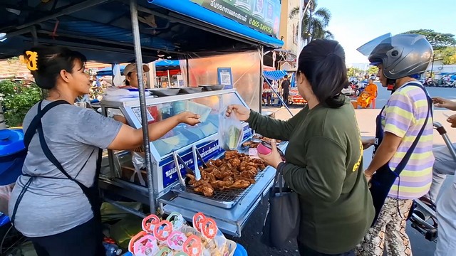 หมูทอดใบมะกรูด หมูแดงรสหวาน หมูสามชั้นทอดกระเทียมพริกไทยข้าวเหนียวอัญชัน ข้าวเหนียวใบเตย ข้าวเหนียวขาวและข้าวเหนียวดำ ห่อละ 20 บาท หมูทอดขีดละ 45 บาท รวมทั้งมีไก่ทอด ที่แสนกรอบอร่อย กรอบนอกนุ่มใน โดยเปิดขายตั้งแต่เวลา 06.30 น.– 10.30 น.