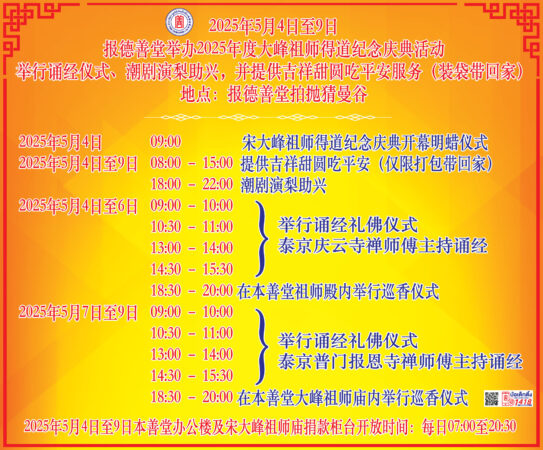 ระหว่างวันที่ 4-9 พฤษภาคม 2568 มูลนิธิป่อเต็กตึ๊ง โดย นายวิเชียร เตชะไพบูลย์ ประธานกรรมการ ขอเชิญศิษยานุศิษย์และสาธุชน ร่วมงานฉลองบรรลุธรรมหลวงปู่ไต้ฮง ประจำปี 2568 ณ มูลนิธิป่อเต็กตึ๊ง พลับพลาไชย กรุงเทพฯสักการะหลวงปู่ไต้ฮง (ไต้ฮงกง) เพื่อความเป็นสิริมงคล ชมการแสดงอุปรากรจีน (งิ้ว) และ รับประทานสาคูสิริมงคล (อี๊)
