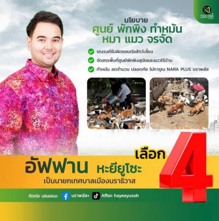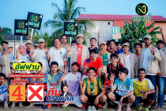 หมายเลข 4 นายอัฟฟาน หะยียูโซะ ทีม “นราพลัส” คนหนุ่มรุ่นใหม่ไฟแรง หน้าตาดี กำหัวใจทั้งรุ่นเล็กรุ่นใหญ่ เดินสู้หาเสียงอ้อนชาวบ้านอย่างไม่เหน็ดเหนื่อยเพื่อจะเอาประสบการณ์ เทคโนโลยีใหม่ๆ มาพัฒนาเมืองนราฯ ให้ทันต่อสถานการณ์ เพื่อก้าวหน้าสู่อนาคต
