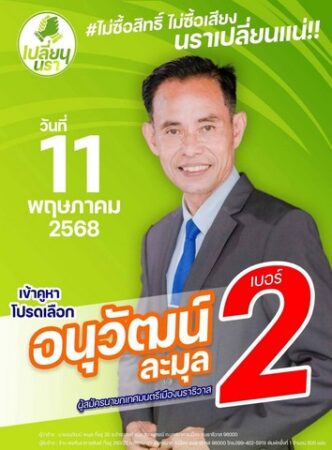 หมายเลข 2 นาย“อนุวัฒน์ ละมุล” ทีม “เปลี่ยนนรา” ลุยเดี่ยว หาเสียง แบบชิวๆ ซึ่งประชาชนพูดเสียงเดียวว่า เป็นตัว “ตัดแต้ม” หรือเปล่า อาจารย์โรงเรียนนราสิกขาลัย จังหวัดนราธิวาส เดินหาเสียงขอคะแนนแบบชิวๆ ก้าวลงสนามการเมืองแบบไม่มีทีมหนุนหลัง ไม่มีแบ็คใหญ่ เกมนี้มาแบบปริศนา ชาวบ้านบอก “ไม่รู้ไม่เห็น” แต่สายการเมืองมองว่า ต้องเป็นตัว “ตัดคะแนน”แน่นอน หรือไม่ จะมีไม้เด็ดแค่ไหน รอดูกัน