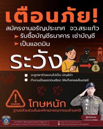 “ตำรวจภูธรภาค 2 ขอย้ำเตือนพี่น้องประชาชนอย่างหลงเชื่อ อย่าหลงผิดด้วยความโลภ หรือข้ออ้างอื่น ๆ เป็นบัญชีม้า ไม่ใช่เรื่องเล็ก ผู้ใดเปิด หรือยินยอมให้ผู้อื่นใช้บัญชี อาจถูกดำเนินคดีตามกฎหมายพระราชกําหนดมาตรการป้องกันและปราบปรามอาชญากรรมทางเทคโนโลยี พ.ศ. 2566 โทษทั้งจำคุกและปรับ โดยล่าสุดก็จับกุมขบวนการล่าม้าเข้าคอกได้ที่ชายแดนคลองลึก พร้อมของกลางจำนวนมาก ดำเนินคดีเด็ดขาด และจะเพิ่มความเข้มในการสกัดกั้นปราบปรามขบวนการนี้อย่างเด็ดขาด ไม่ปล่อยไว้แน่นอน” ผบช.ภ.2 กล่าว