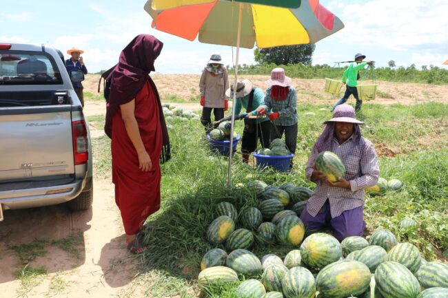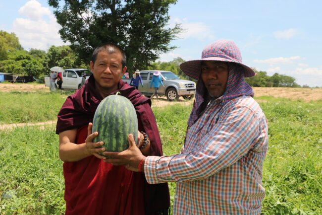 ด้านพระธนวัฒน์ ชยวฑฒโน เลขานุการเจ้าคณะตำบลหินกอง และพระสุทธิพงษ์ ธมมสุทโธ เลขานุการวัดหินกอง เปิดเผยว่า เนื่องจากโยมบอกว่าแตงโมขายไม่ออกเรียกว่าแตงตาย และได้ขอความอนุเคราะห์ให้ช่วยเหลือหน่อย หลวงพ่อวัดหินกอง อ.เมือง ก็เลยจะช่วยเหลือเท่าที่พอช่วยได้ ทางวัดโดยเจ้าอาวาสวัดหินกองท่านเมตตาอยากช่วยเหลือด้วย เบื้องต้นจะนำไปแจกให้กับศูนย์พัฒนาเด็กเล็กออทิสติกที่วัดห้วยหมูได้ดูแลอยู่ และแจกให้ผู้ป่วยติดเตียง ชาวบ้านในหมู่บ้านชุมชน ตอนนี้ได้ช่วยเหลือซื้อไปแล้ว 2 คันรถ คันรถละ 1 ตัน รวม 2 ตัน อยากช่วยกัน คือโยมลำบาก พอวัดลำบากก็แบ่งปันกัน เราก็ช่วยเหลือกันเกื้อหนุนกันไป วันนี้มาลงพื้นที่เองเพราะอยากรู้และสัมผัสพื้นที่จริง ๆ ว่าเกิดปัญหามาจากอะไร และก็จะได้เอาแตงโมไปแจกให้กับชาวบ้านเองด้วย